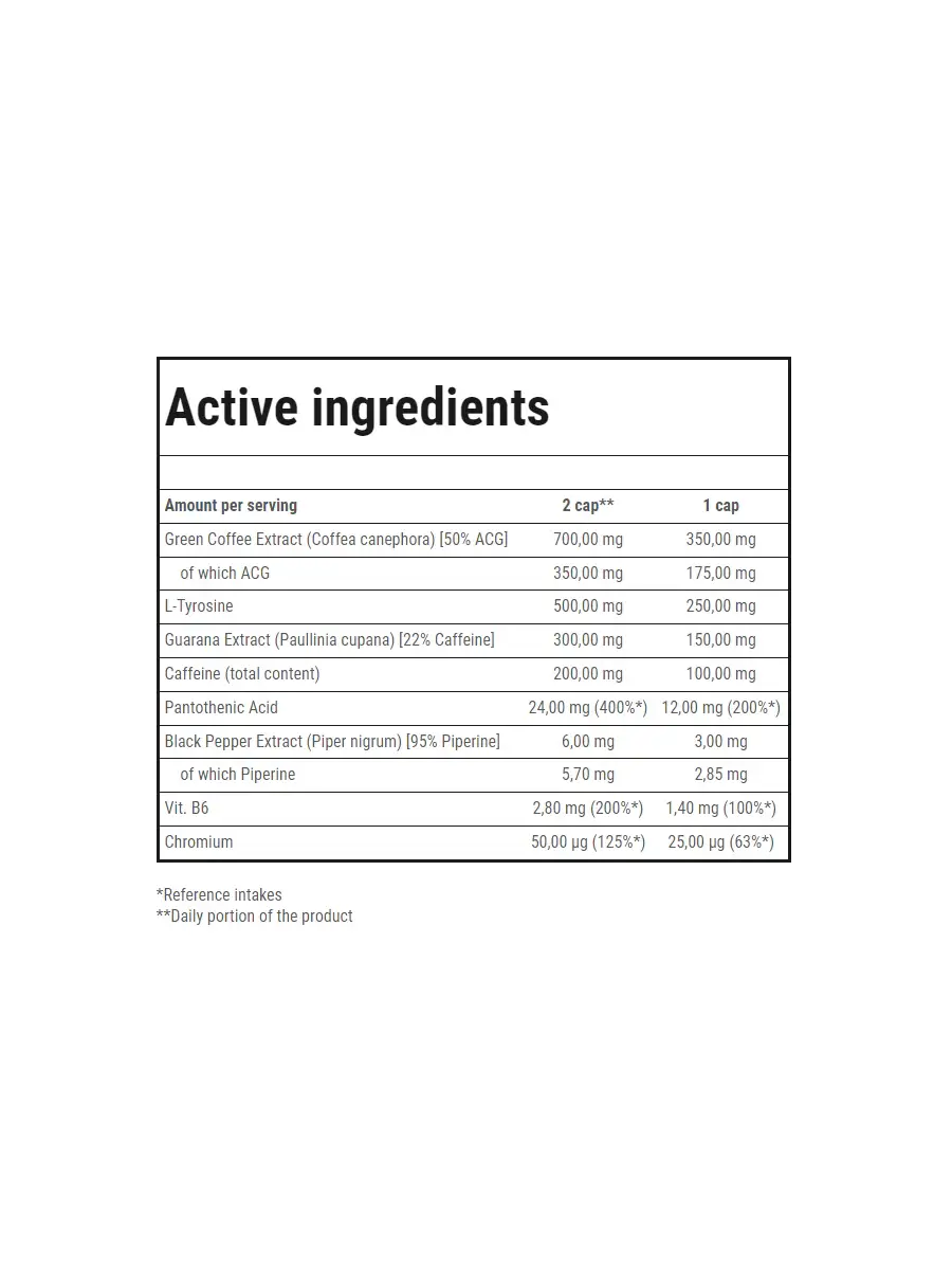 Состав: Экстракты зелёного чая, горького апельсина, кофеин, L-карнитин и другие натуральные компоненты, направленные на ускорение метаболизма и расщепление жировых клеток.