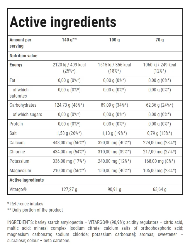 - Vitargo® – запатентованный источник углеводов с высокой молекулярной массой для моментального восполнения энергии.